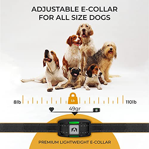 100% Waterproof training collar for dogs: Our lightweight 49g dog shock collar with remote is equipped with a fully waterproof receiver. The E collar can serve as a bark collar. Suitable for 8lbs~110lbs size dogs. Perfect fit shock collar for large dogs and 6 months babies.